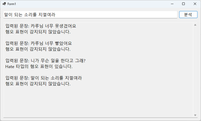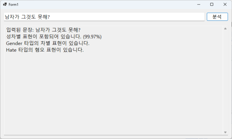기능을 새로 추가했습니다. 99.97%의 확률로 성차별 표현이라고 인식했죠. 이거 나중에 잘하면 일정 % 이상의 경우에만 차별 표현으로 인식시킬 수도 있습니다. 그러면 혐오표현을 걸러내는 능력은 좀 떨어지더라도, 실수는 줄일 수 있겠죠.