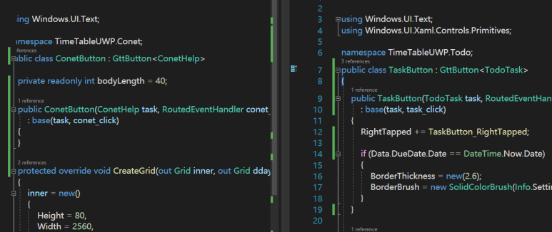 세 클래스에서 동시에 작업을 해야 하기 때문에 5분할로 나누었습니다. 양쪽은 제가 그냥 확인하기 위한 패널들이고, 가운데 두 개 뭔가 쫙 써있는 게 현재 버튼 코드들, 그리고 맨 왼쪽은 이제부터 작성할 "공통 버튼"입니다. 실제로 개체화할 순 없지만 이 둘, 그리고 추후에 생길 새 버튼의 특징까지 묶을 수 있도록.