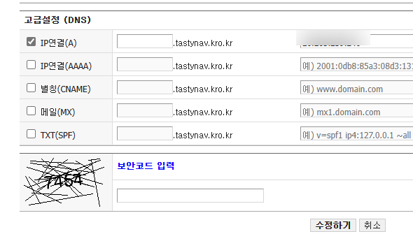 저는 내도메인.한국 사이트를 이용했습니다. 주의할 것은 '웹포워딩'이 아니라 'IP연결(A)'에 작성해야 한다는 겁니다. 혹시 서버가 IPv6를 쓴다면 AAAA에 작성해주세요. 여기에 Azure 서버의 외부 주소를 작성하면 도메인 연결이 완료됩니다. 저는 tastynav.kro.kr을 사용하겠습니다.