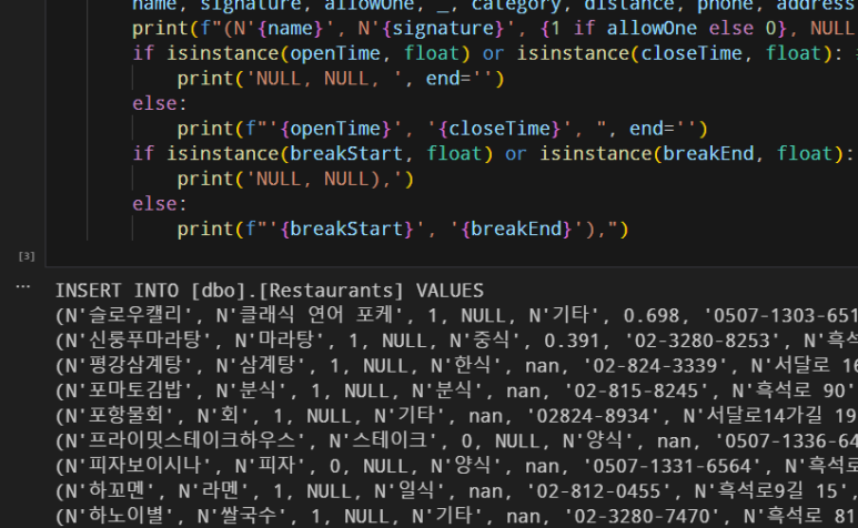 SQL DB에 데이터를 삽입할 때는 INSERT INTO ~ 구문을 사용합니다. 그런데 이거 저희가 조사한 데이터셋이 좀 많아요. 그래서 엑셀 파일을 pandas에서 불러온 후, 전처리를 거쳐 자동으로 query를 작성해주는 프로그램을 따로 제작했습니다. 이러면 깔끔하게 쿼리가 만들어진 게 보이죠. 이걸 MSSQL DB에 날려주면 간단히 끝납니다.