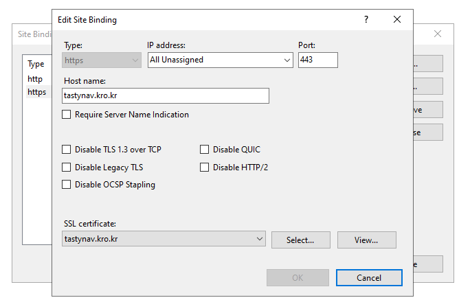 IIS 옵션으로 들어가서 Binding 옵션을 통해 80포트와 443 포트를 연결해주어야 합니다. 아까 발급받은 도메인을 입력해주세요. 그리고 인증서는 방금 등록한 인증서를 골라주시면 됩니다. 참고로 하위도메인의 경우 각각 다른 인증서를 발급받고, 등록해야 합니다.