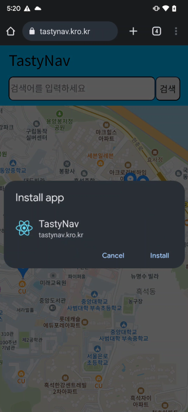 제가 폰을 4개씩 들고 다니는 이유가 있습니다. 여러 상황에서 테스트를 해야 하거든요. 여튼, HTTPS 적용을 하고 난 뒤 PWA 설치 팝업이 성공적으로 떴습니다. 앱 설치가 끝나면 네이티브 앱처럼 부드럽게 동작합니다. 이제 본격적으로 UI를 다듬을 차례입니다.