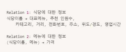 왼쪽이 Primary key이고, 오른쪽은 Relation입니다. 어차피 A -> A를 만족하니까 그냥 최소한의 칼럼명만 썼습니다. 대강 어떻게 테이블이 구성되어 있는지 이해가 되시죠? 하나는 식당 정보만, 하나는 메뉴 정보만 담고 있는 겁니다. 두 테이블에서 공통으로 식당이름을 저장하고 있으니, 나중에 이 점을 이용하여 자료를 조회하면 되겠죠. Relation 2의 PK는 (식당이름, 메뉴)지만 FK는 식당이름이 되겠군요.