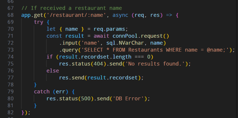프론트에서는 useEffect 함수 내에서 지도를 그립니다. 이때 search 파라미터에 훅을 걸어두었습니다. App.js에서 사용자가 검색창에 어떠한 단어를 입력하면, 입력된 단어의 변화를 감지하고 지도 그리기가 트리거됩니다. 그러면 내장되어있는 검색 기능이 동작합니다. 검색 결과에 맞는 맛집 목록만 받아 마커를 생성할 수 있습니다. 내부적으로는 SQL의 LIKE 구문을 이용합니다. 참고로 쿼리를 작성할 때는 JavaScript 내장 String Interpolation (`string${var}`)이 아닌, input() 메서드를 사용해야 합니다. 자칫 SQL Injection 공격에 취약해질 우려가 있습니다.