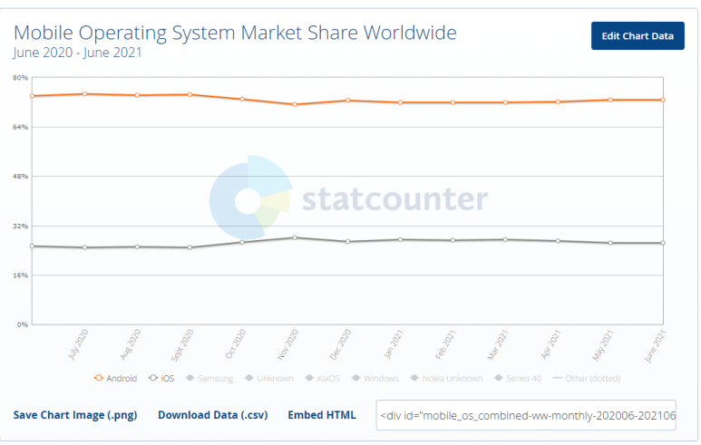 모바일로 와보면 더 답이 없습니다. 안드로이드가 80%, iOS가 20% 정도를 차지하고 있어요. 사실 우분투, 윈도우 폰, 타이젠, 블랙베리 등등 다른 OS를 개발하고자 하는 시도는 있었는데, 안드로이드가 너무 강력해서 묻혀버렸습니다. 날이 갈 수록 양대산맥은 점점 굳건해지고 있죠.