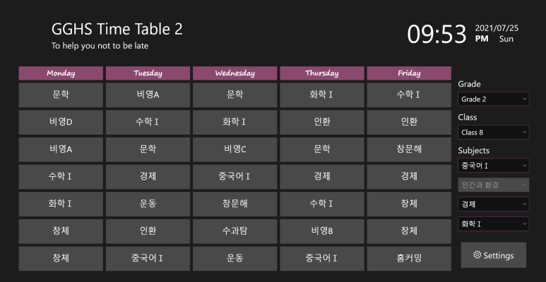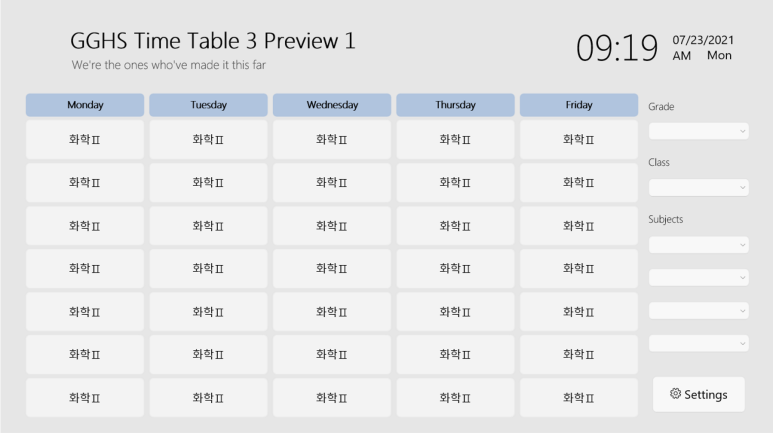 WPF와 UWP를 비교했을 때는 조금 신경쓸 게 많습니다. WPF는 그냥 일반적인 프로그램으로 봤을 때, UWP는 마이크로소프트 스토어(구 윈도우 스토어)를 통해 받을 수 있는 앱을 뜻합니다. 특히 특유의 메트로 디자인이 특징이죠. 평면적입니다. 그런데 WinUI 2.6즈음부터 아이콘과 버튼들이 점점 입체적으로, 예쁘게 변하기는 했는데, 이 얘기는 다음 글에서 하죠. 아무튼, UWP는 윈도우 데스크탑, 윈도우 모바일, TV, Xbox등 모든 플랫폼에서 이용할 수 있는 것을 목표로 합니다. 이게 뭐죠? 네, 크로스 플랫폼을 지원한다는 뜻입니다. UWP 초기에는 마이크로소프트에서 UWP를 많이 밀어줬는데, 요즘엔 지원이 다소 약해졌어요. 그러나 윈도우 11이 나오고 WinUI 2.6 이상이 되면서 UWP의 디자인이 전체적으로 변화되고, 예뻐졌습니다. 멀리 갈 필요도 없이, 제가 2021년에 만들었던 GGHS Time Table을 보여드릴게요.
