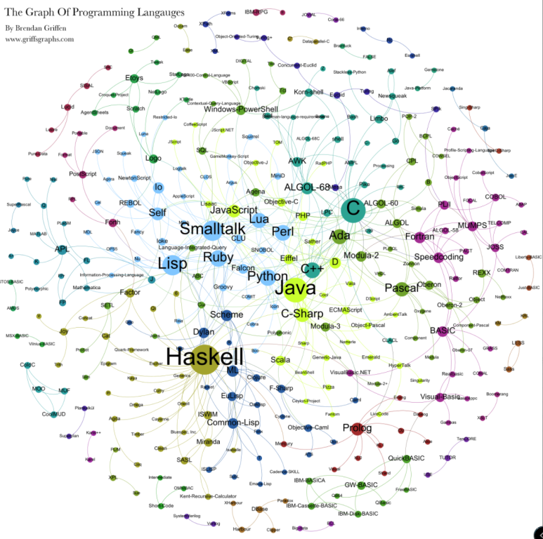 종류가 이렇게 많아요. C, C++, Java, Haskell, C-Sharp등이 보이죠. 아무튼, 대부분의 메이저 프로그래밍 언어는 C언어의 문법을 기반으로 만들어졌습니다. 그래서 대부분 프로그래밍을 처음 배우는 분들께 C언어를 권하죠. 그런데 예외가 있습니다. 파이썬. 파이썬은 괴상한 문법을 사용합니다. 코딩 스타일을 강제해요. 대신, 강제적으로 통일되기 때문에 코딩 스타일이 달라 해석이 어려울 수 있는 문제점을 사전에 막을 수 있습니다. 코드가 짧아지는 단점도 있지요. 그래서 파이썬의 문법을 다시 가져가는 언어들도 많습니다. 특히 C#은 파이썬과 C언어의 문법이 적절히 섞인 형태입니다. (f-string => $-string, with -> using 등등...)