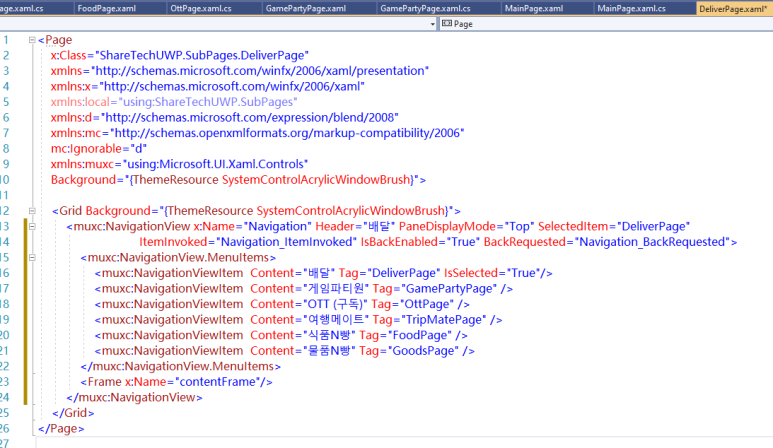 자, 왼쪽은 큰 틀 디자인입니다. MainPage.xaml 페이지에서 시작해서 서브메뉴를 클릭할 경우 각각의 Page들로 넘어가는 형식을 취했었죠. 이건 지난번에 보여드렸습니다. 오늘은 그냥 제가 구현만 조금 더 얹은 거고요.