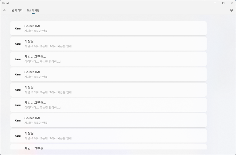 위 보이는 게시글은 제가 임의로 만들어서 넣어둔 겁니다. 실제로 사용할 땐 다른 사람들이 글을 작성하겠죠. 참고로 저 글 목록도 모두 다 버튼입니다.