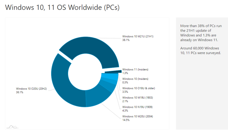 위 사이트에 들어가보면 윈도우 10/11의 버전별 점유율을 확인할 수 있습니다.