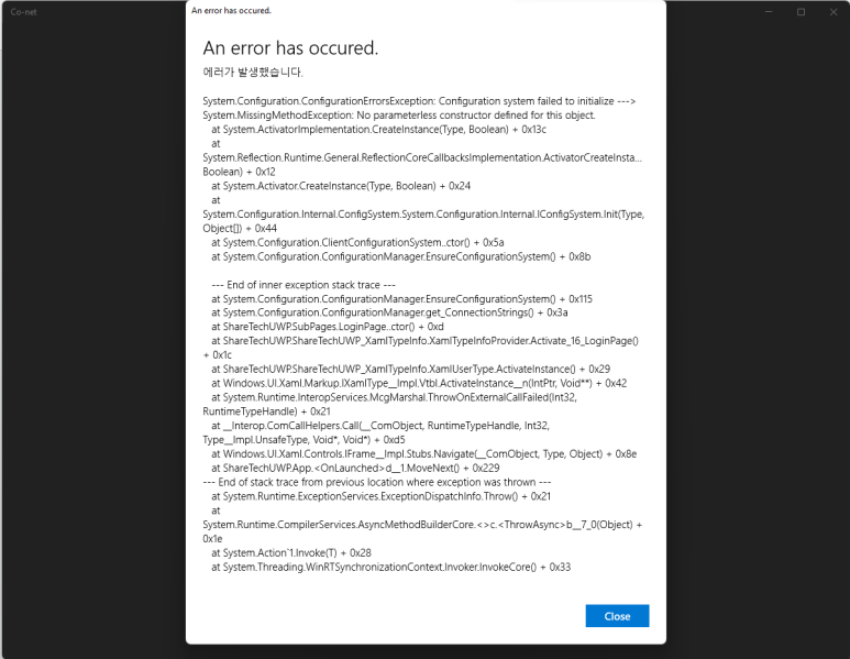 Co-net에 문제가 생겼습니다. 버전 0.1.3에서 일어났던 일인데, 스토어에서 앱을 다운받고 실행하면 아래와 같은 메시지가 나옵니다.