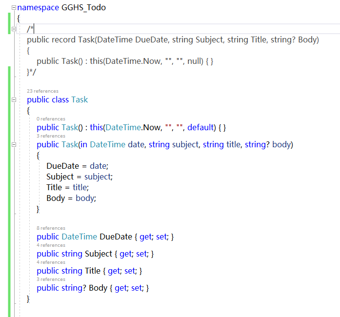 하는 수 없이 기존 Task 객체의 타입을 변경했습니다. 이 당시에는 C#의 record 타입을 잘 알지 못했어요. 뭐 C# 10에서는 record struct도 나온다고 하는데, 지금 상황이랑은 관련이 없으니 생략하죠. 아무튼, 저렇게 만들어줍니다. 여기서 default constructor을 정의한 이유는 XML Serialization 때문에 그래요. default ctor이 없으면 Serialization이 안 됩니다. 오류를 뿜어대요. 왠진 모르겠는데.