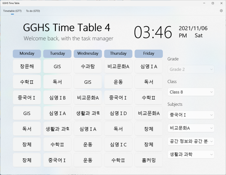 GGHS Time Table은 제가 2021년 5월부터 만들었던 고양국제고 시간표 프로그램입니다. 5월 첫째 주, GTT 1.0을 시작으로 지금까지 꾸준히 업데이트 되었는데요. 단순한 시간표에서 끝나지 않고, 선택과목에 맞추어 본인만의 시간표를 보여줍니다. 뿐만 아니라, 시간표의 각 칸을 누르면 해당 과목의 줌 링크와 및 클래스룸 링크까지 띄워줍니다. 버튼 한 번만 클릭해서 바로 줌을 열 수 있는 거죠. 이제 모든 클래스룸을 찾아다니면서 번거롭게 줌 링크를 찾을 필요가 없습니다.