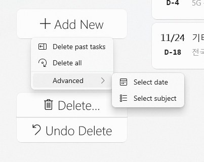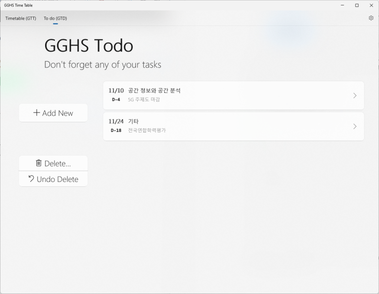 상단바에서 To do (GTD)를 누르면 일정 관리 탭에 들어올 수 있습니다. 여기서 Add New 버튼을 눌러 수행평가 목록을 추가할 수 있습니다.