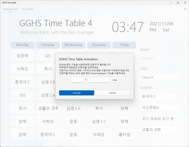 상단바에서 'Timetable (GTT)'를 누르면 다시 시간표로 돌아옵니다. 시간표의 각 칸을 누르면 줌 링크 및 클래스룸 링크가 띄워집니다. 기수톡에 공지된 인증키를 사용하거나, 제게 받은 인증키를 여기에 입력해주세요.