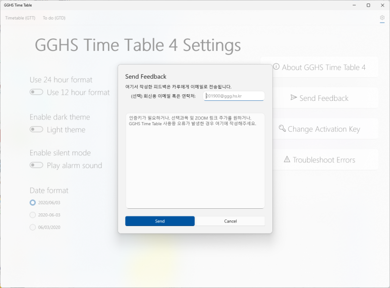 설정 창에서 피드백을 보낼 수 있는데, 선택과목 및 ZOOM 링크 추가를 원할 때, 혹은 GTT 오류가 발생한 경우 본문에 해당 내용을 작성하시면 됩니다. 만약 회신이 필요한 경우 이메일 주소 또는 전화번호 등의 연락처를 적어주세요. 확인 후 제가 이메일로 답변을 드릴 겁니다. gghstimetable@gmail.com 주소로요.