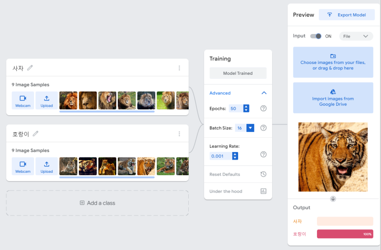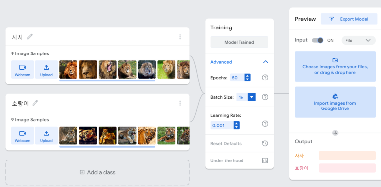 이렇게 페이지가 뜬다. 클래스룸에서 받은 실험데이터를 토대로 호랑이와 사자를 구분하도록 학습시켜보자. 여기서 사용할 것은 train set이다.
