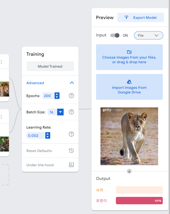 일단 보면 알겠지만, 여기서도 binary classification을 할 것이다. train set이 준비되었다면 Train Model 버튼을 눌러 학습시키자. 학습이 끝나면 오른쪽 처럼 뜨는데, 이제 Preview 창에서 train set의 데이터 중 아무거나 하나를 업로드해보자.