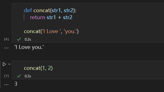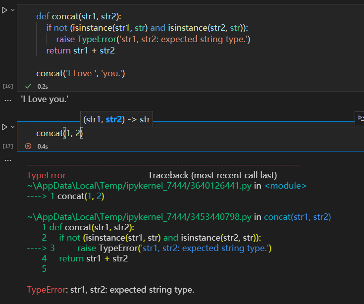 자, 여기 보시면 함수의 원형을 바꾸었습니다. str1, str2를 아까 위에서 본 대로 타입을 선언했습니다. 끝 부분의 -> str은 C++의 trailing return type이랑 비슷해보이죠. 함수의 반환값을 직관적으로 알 수 있게 해줍니다.