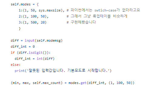 이건 실제로 제가 2학년 '창의적문제해결기법' 시간에 과제로 제출했던 코드 중 일부입니다. 전체 코드는 karu-rress/Updown (github.com) 에서 확인할 수 있어요. 지금 무슨 코드인지 바로 감이 안 오실텐데, 룩업테이블을 구현한 겁니다. 딕셔너리에 인덱스를 매기고 할당할 값들을 튜플로 넣어놨어요. 그 다음, get 메서드를 통해 인덱스에 맞는 값들을 unpack하는 겁니다. 이때 diff_int의 값이 인덱스에 해당하지 않는다면 default 값으로 두 번째 파라미터를 대입하는 겁니다.