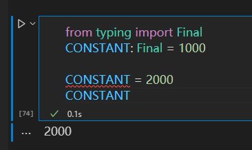 방법 1의 경우 typing 모듈에서 Final 클래스를 불러오는 겁니다. Final 타입으로 설정하고 인스턴스 이름을 대문자로만 설정해두면 인텔리센스가 '아 얘 상수구나' 하고 상수 취급을 해줘요. 그런데 편집기에서만 그러고, 실제로 작동은 멀쩡히 잘 됩니다.