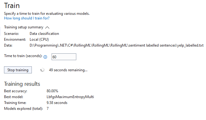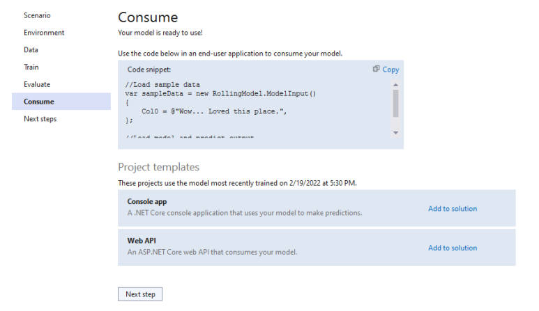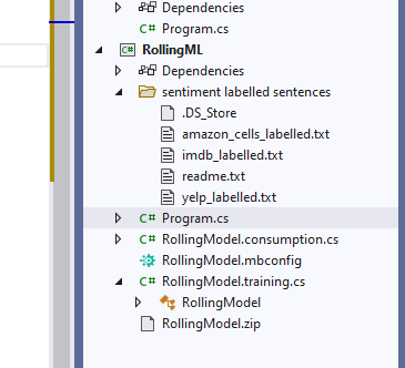 테스트가 끝나고 우리가 검증을 하면, 본격적으로 머신러닝 모델을 사용할 수 있게 됩니다. RollingModel.zip은 머신러닝이 완료된 파일이라 보시면 되고, RollingModel.consumption과 .training은 VS에서 자동으로 만들어낸 파일이에요. 얘네가 모델을 만들어줬으니, 우린 그냥 갖다 쓰기만 하면 됩니다.