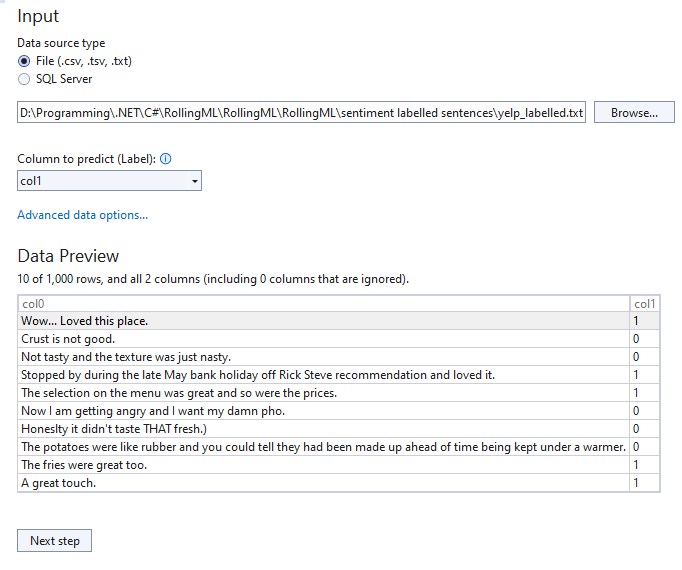이번에 할 프로젝트는 머신러닝을 통해 문장의 부정/긍정을 판정하는 것입니다. 테스트 데이터에는 문장이 하나 있고, 긍정이면 1, 부정이면 0이 뒤에 따라붙습니다. 우리는 문장을 통해 긍정/부정의 결과를 유추해낼 것입니다. 실습을 위해 1000개의 문장이 적힌 파일을 받습니다. MS에서 제공해줍니다.