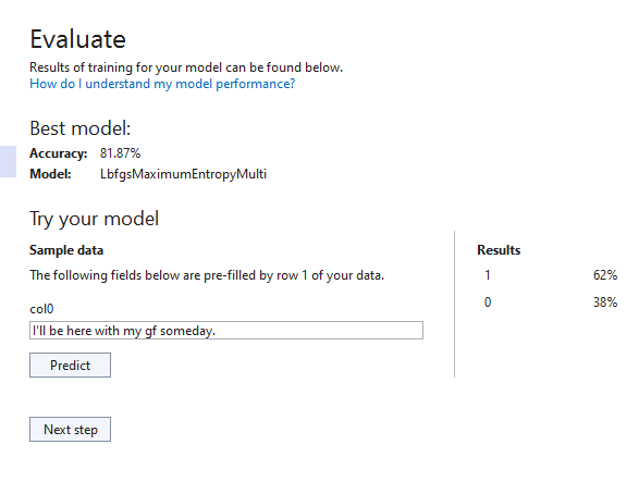 자, 코드를 이렇게 작성해봅시다. samples에는 Input 객체가 있는 거예요. 하...파이썬 안 보니까 살 것 같다. 텍스트 데이터는 Col0에 있습니다. (원한다면 RollingModel.consumption.cs에서 바꿀 수 있습니다) foreach문을 통해 반복하면서, Result와 추론 퍼센티지를 각각 측정합니다. 소수점 셋째 자리에서 반올림해서 출력합니다.