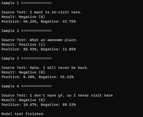 Console.WriteLine("Model test finished.");