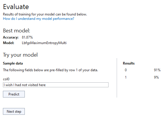 Console.WriteLine($"Result: {(result.Prediction is 1 ? "Positive (1)" : "Negative (0)")}");