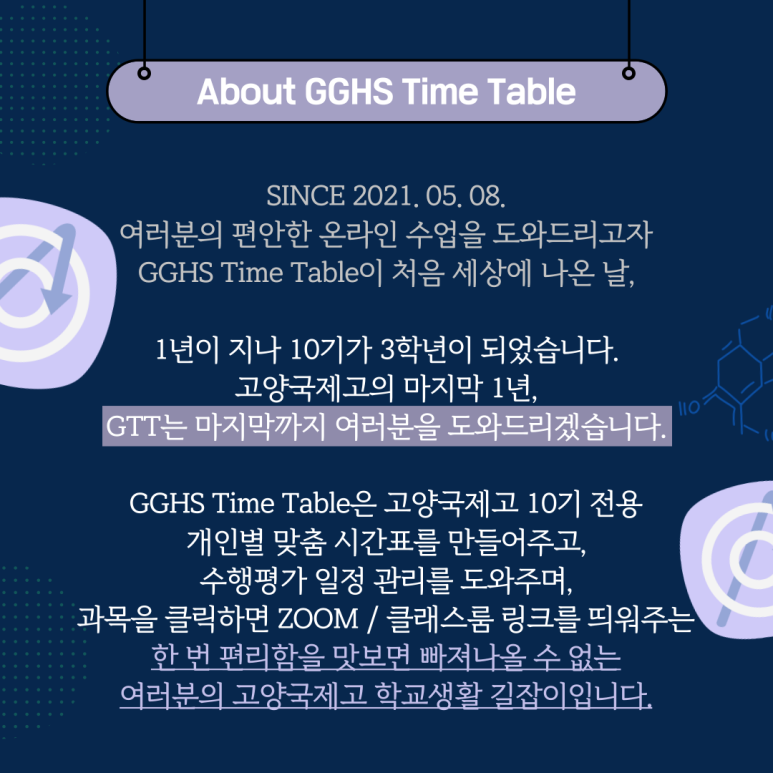 GTT는 10기 전용 고양국제고 시간표 프로그램으로, 학급과 선택과목을 고르면 자신만의 시간표를 만들어주는 프로그램입니다. 전면등교를 시행하는 관계로 이번에는 ZOOM 링크 기능이 빠져있지만, 대신 독특하고 새로운 기능을 선보입니다.