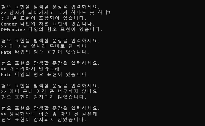 프로그램을 실행하면 이렇게 뜹니다. 어떤 문장을 입력하는지에 따라 결과가 조금씩 달라지는 걸 볼 수 있습니다. 참고로 성차별 표현은 제대로 잡아내지 못하는 경우가 있어요. 딱히 '이건 아닌 것 같은데?' 싶은 표현도 성차별로 무턱대고 감지하는 경우가 있어서. 이건 그냥 분류기 자체의 문제로 봐야할지.